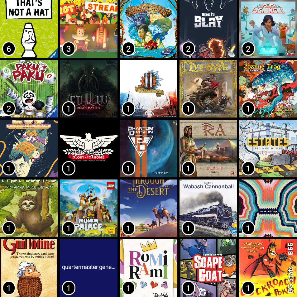 - The other good stuff thats not quite new: Scout, Spirit Island, Cthulhu: DMD, Cosmic Frog and Wabash Cannonball, Ra, Paku Paku, Through the Desert are all still great and loved.